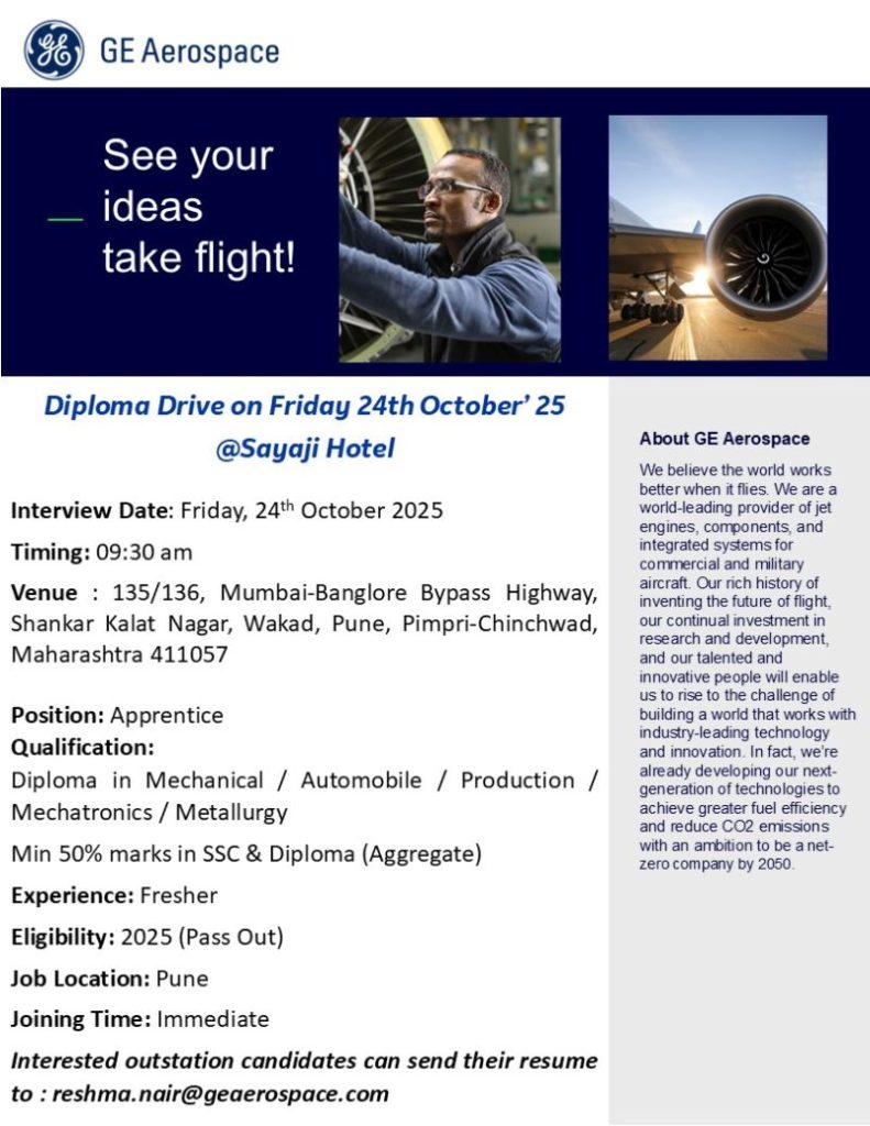 Walk in Interview for Freshers in Pune for Non It Domain: GE Aerospace Apprentice Opportunities